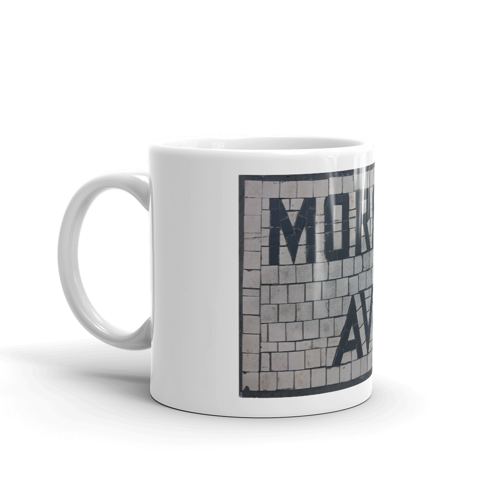 Morgan Ave Stop on the L Train Mug. It's sturdy and glossy with a vivid print that'll withstand the microwave and dishwasher.